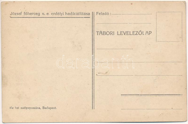 Leégett székely ház, benne rögtönzött tábori posta. Tervezte Medgyaszay. József főherceg vezérezredes erdélyi hadikiállítása / WWI Austro-Hungarian K.u.K. military exhibition, burnt down Székely house with improvised field post offic