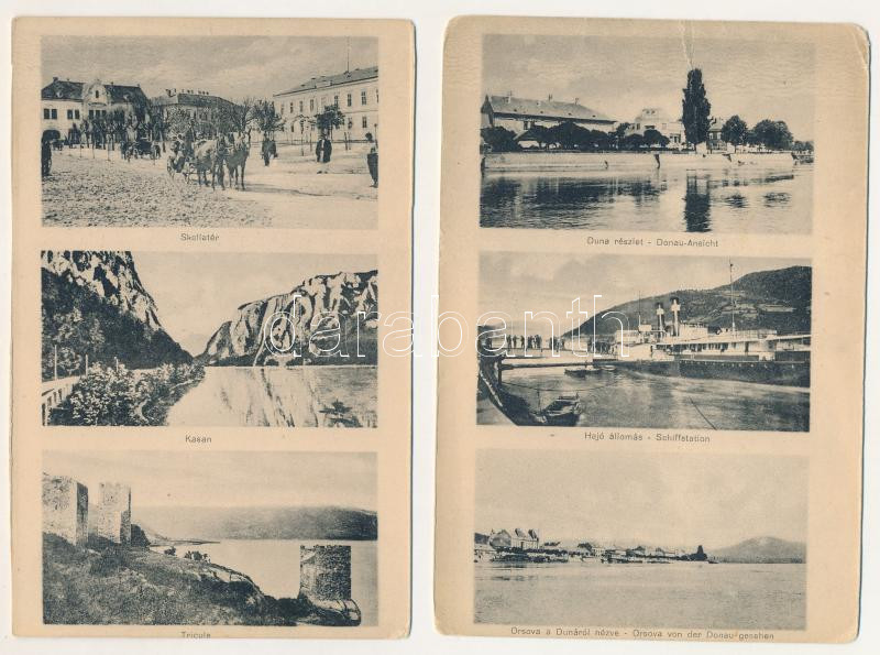 Beschreibung: Orsova - 2 db RÉGI mozaiklap: hajóállomás, Duna, Skella tér, Kasan, Tricule / 2 db pre-1945 multi-view postcard: ship station, Danube, square