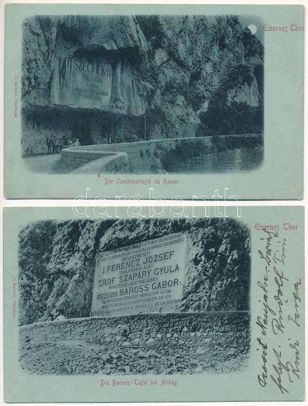 Orsova, Kazán-szoros, Vaskapu-szoros, Széchenyi emléktábla, Baross emléktábla Alibégnél, este holdfényben. C. Kehrer kiadása (Oravica) / Cazane, Portile de Fier / gorge, canal, monuments at night in moonlight - 2 db régi (1905 előtti) képeslap / 2 pre-1905 postcards