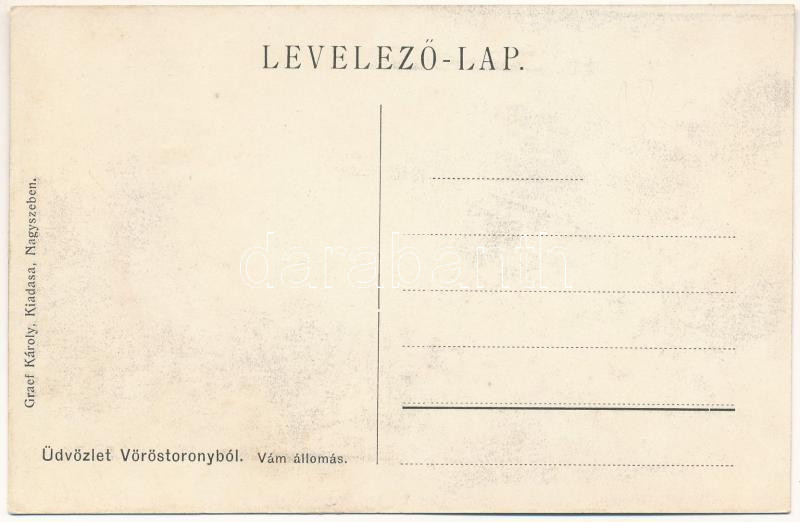 Beschreibung: Vöröstorony, Verestorony, Porcsesd, Porcesti, Turnu Rosu; Vám állomás. Graef Károly kiadása (Nagyszeben) / customs station (ázott sarok / wet corner)