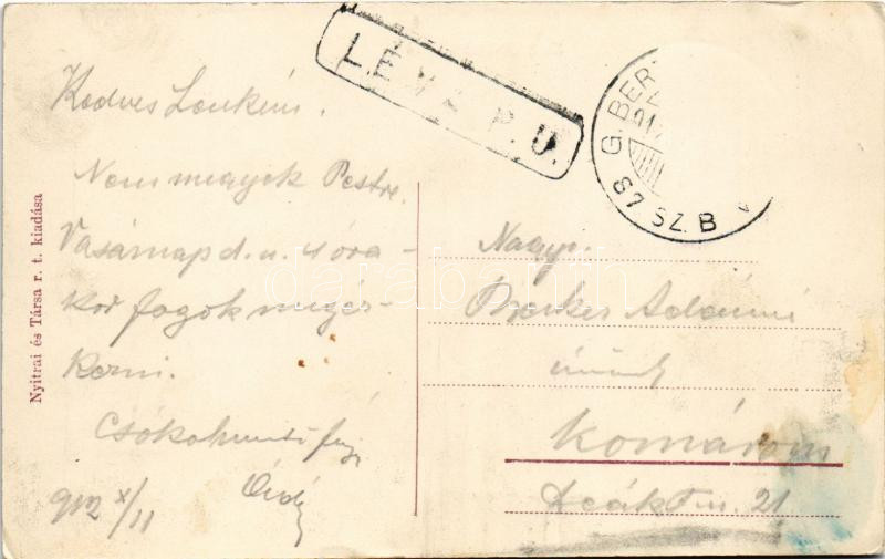 1912 Léva, Levice; Kossuth tér, piac, Városi kávéház, Állami tanítóképző, Kertész Lajos, Holzmann Bódog üzlete. Nyitrai és Társa kiadása / square, market, café, teachers' training institute, shops (felületi sérülés / surface damage)