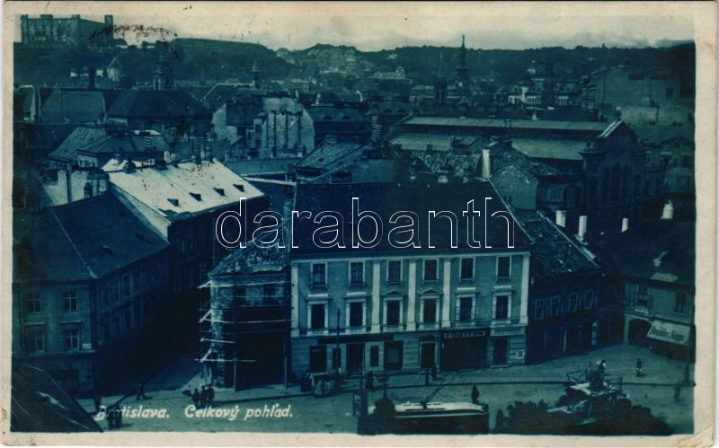 Pozsony, Pressburg, Bratislava; Celkovy pohlad, Coiffeur, Mliekaren. J. Scepán / látkép, üzletek, villamos, vár / general view, shops, tram, castle (EK)