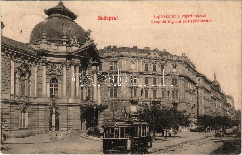 1909 Budapest XIII. Lipót körút a Vígszínházzal, villamos, mozi (fl) https://www.darabanth.com/de/506-Fernauktion/506.0/Ansichtskarten/Ungarn~111/1909-Budapest-XIII-Lipot-korut-a-Vigszinhazzal-villamos-mozi-fl~II3430542