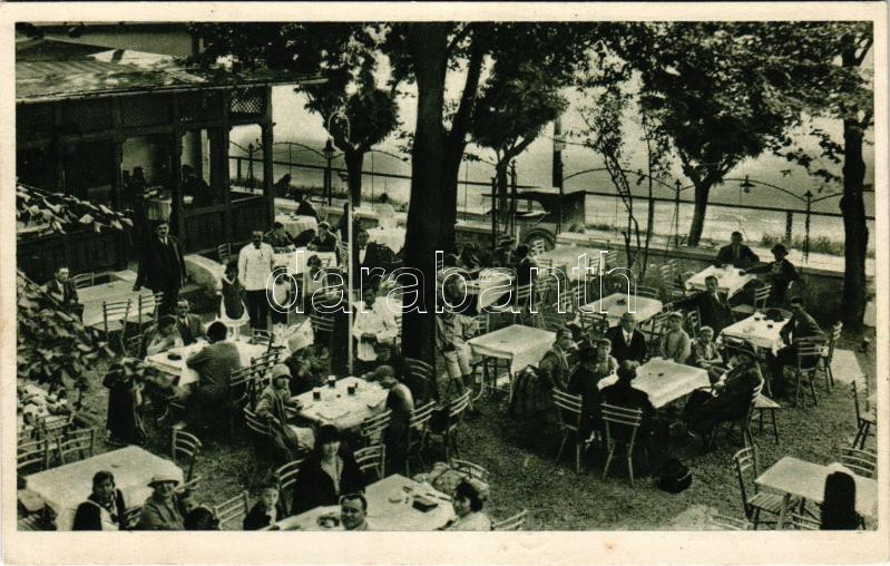 Beschreibung: 1931 Visegrád, Papp Ferenc vendéglője és étterme a Dunasoron, kert vendégekkel és pincérekkel