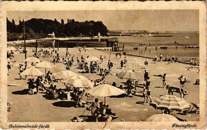 1937 Balatonalmádi, Fövenyfürdő, strand (fl) https://www.darabanth.com/de/506-Fernauktion/506.0/Ansichtskarten/Ungarn~111/1937-Balatonalmadi-Fovenyfurdo-strand-fl~II3429942