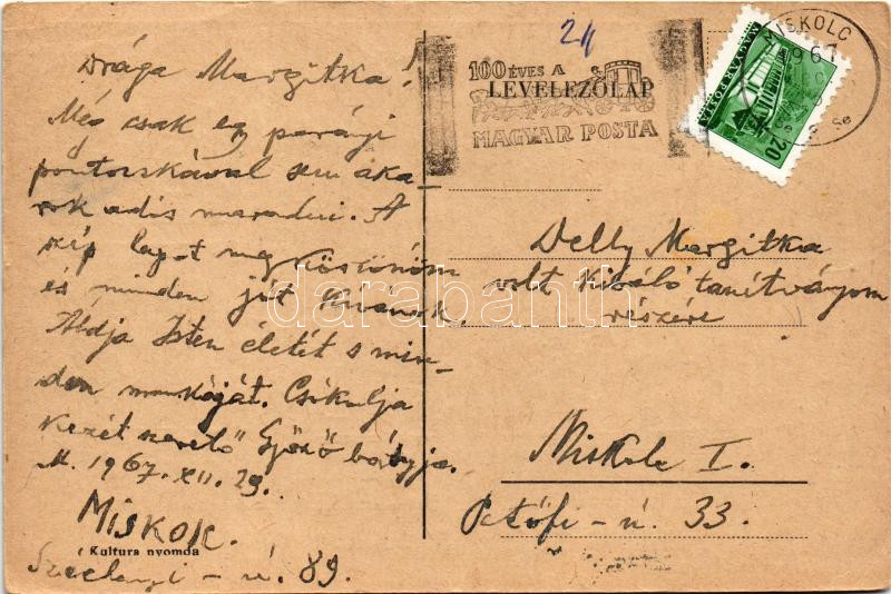 Beschreibung: 1967 Miskolc, Révay József Gimnázium. Bethlen Gábor Kör kiadása s: Kiss Károly + "100 éves a Magyar Posta" (EB)