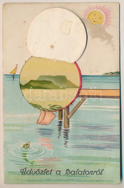 Beschreibung: Badacsony, Üdvözlet a Balatonról! kihajtható napernyős leporellólap (üres)