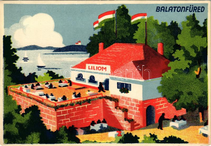 Beschreibung: Balatonfüred, Liliom étterem, kávéház, bár, cukrászda, borpince. Tulajdonos Ujváry Rezső, a budapesti Liliom társtulajdonosa. Reklámlap, litho