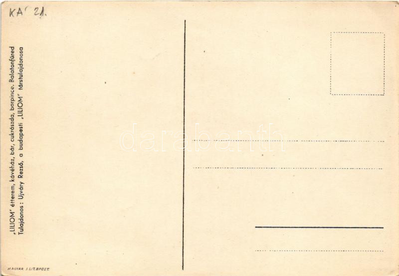 Balatonfüred, Liliom étterem, kávéház, bár, cukrászda, borpince. Tulaj... https://www.darabanth.com/de/506-Fernauktion/506.0/Ansichtskarten/Ungarn~111/Balatonfured-Liliom-etterem-kavehaz-bar-cukraszda-borpince-Tulajdonos-Ujvary-Rezso-a~II3430032