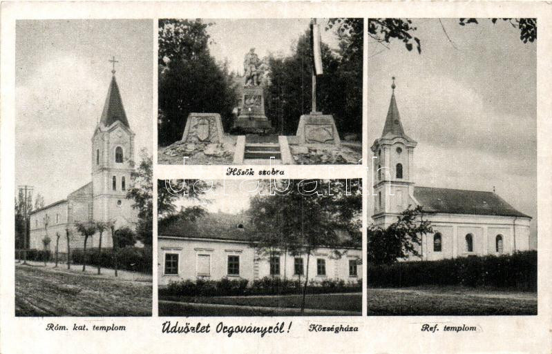 Beschreibung: Orgovány, Hősök szobra, községháza, római katolikus templom, református templom (fa)