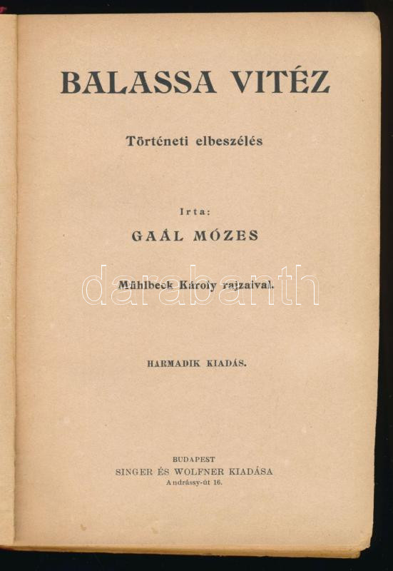 Gaál Mózes: Balassa vitéz. Történeti elbeszélés. Mühlbeck Károly rajzaival. Filléres Könyvtár 48-50. köt. Bp., [1913], Singer és Wolfner, 127+(1) p. Harmadik kiadás. Kiadói illusztrált félvászon-kötés, kissé foltos, koszos borítóval.