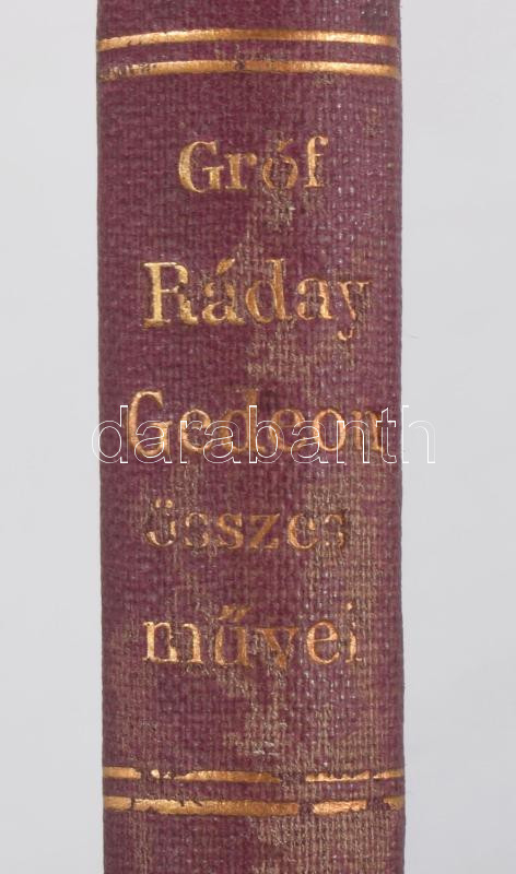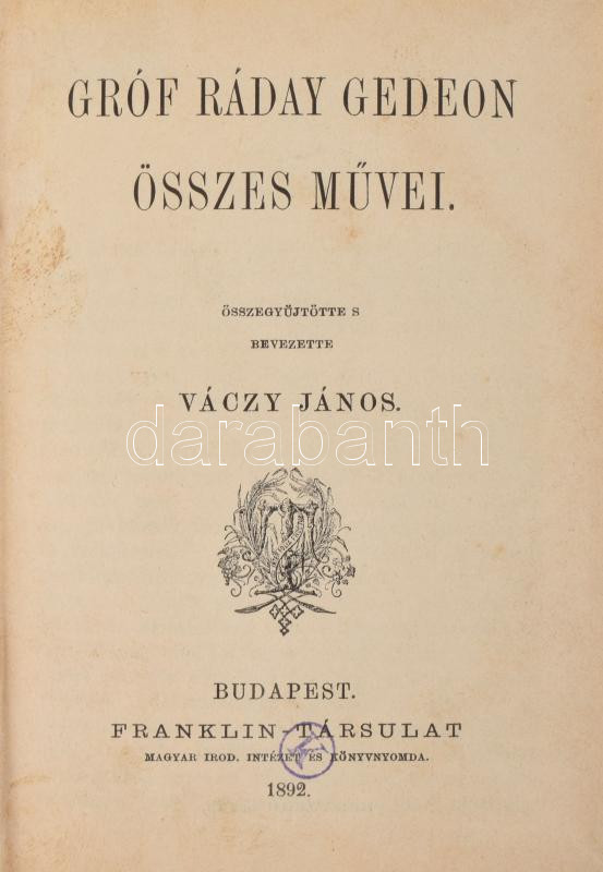 Gróf Ráday Gedeon összes művei. Összegyűjtötte s bevezette: Váczy János. Bp., 1892, Franklin, 186+4 p. Átkötött aranyozott félvászon-kötés, kissé kopott, kissé foltos borítóval.