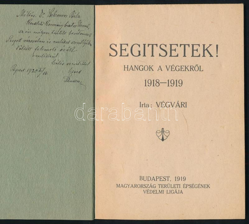 [Reményik Sándor] Végvári: Segítsetek! Hangok a végekről 1918-1919. Bp., 1919, Magyarország Területi Épségének Védelmi Ligája (Hornyánszky-ny.), 63+(1) p. Első kiadás. Kiadói papírkötés, kissé foltos borítóval, egyébként jó állapotban, felvágatlan lapokkal. Kelemen Béla (1863-1944) jogász, ügyvéd, politikus, országgyűlési képviselő, Csongrád vármegye és Szeged főispánja, kerületi kormánybiztos részére szóló ajándékozási bejegyzéssel: ,,Méltós. Dr. Kelemen Béla kerületi kormánybiztos Urnak, az én mélyen tisztelt barátomnak [...]" (azonosítandó aláírással).