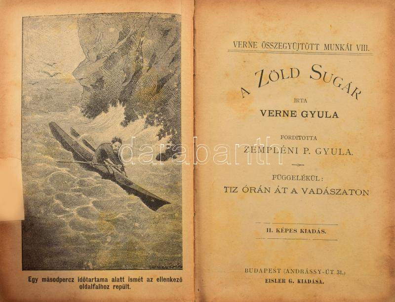 Verne Gyula: A zöld sugár. Függelékül: Tíz órán át a vadászaton. Ford.: Zempléni P. Gyula. Verne összegyűjtött munkái VIII. Bp.,én.,Eisler G., 265 p. II. képes kiadás. Gazdag fekete-fehér képanyaggal illusztrált. Átkötött félvászon-kötés, az eredeti illusztrált elülső borítót az átkötéskor felhasználták, kopott borítóval, egy szakadt lappal, a címkép javított.