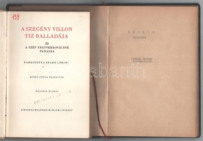 [Villon, Francois]: A szegény Villon tíz balladája és A szép fegyverkovácsné panasza. Ford.: Szabó Lőrinc. Hincz Gyula rajzaival. Bp., [1943], Singer és Wolfner, 71+(1) p. Második kiadás. Kiadói félvászon-kötés, foltos, sérült borítóval és gerinccel, tulajdonosi névbélyegzővel. + Francois Villon balladái Faludy György átköltésében. H.n., é.n., (3)+54 p. Kalóz kiadás. Félvászon-kötésben.