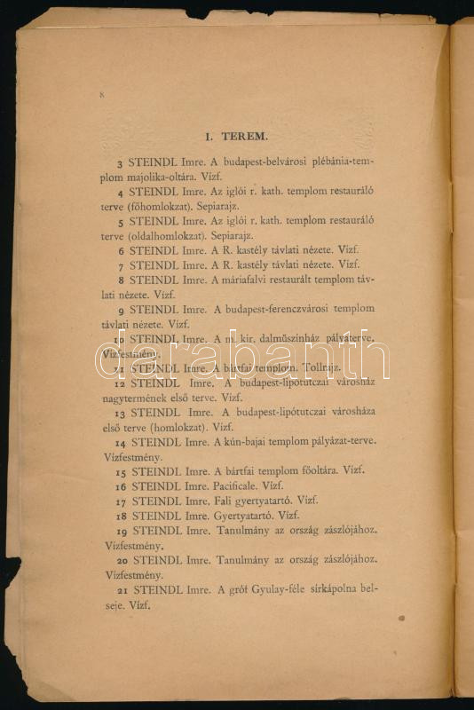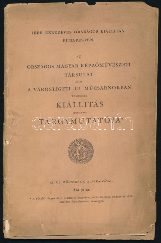 1896. Ezredéves Országos Kiállítás Budapesten. Az Országos Magyar Képzőművészeti Társulat által a Városligeti Uj Műcsarnokban rendezett Kiállítás ideiglenes tárgymutatója az uj Műcsarnok alaprajzával. 79p. Sérült papírborítóval