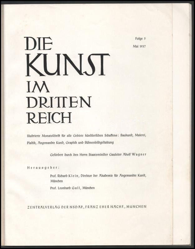 1937 Die Kunst im Dritten Reich. Folge 5. Mai 1937. München, 1937, Zentralverlag der NSDAP. Gazdag fekete-fehér képanyaggal. Német nyelven. Kiadói papírkötés, kissé viseltes, foltos borítóval.