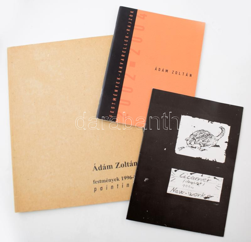Ádám Zoltán (1959-2022) festőművész munkáit bemutató 3 db katalógus: Festmények 1996-1998 + festmények, akvarellek, rajzok 2002-2004. + Cicamunkák. New works 1994. Kiadói papírkötés.