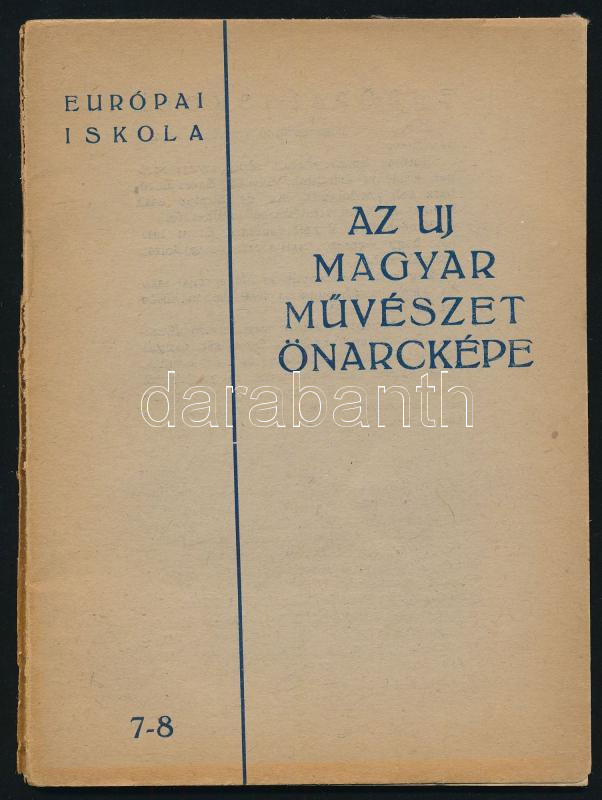 Az új magyar művészet önarcképe. Európai Iskola Könyvtára 7-8. Szerk.: Pán Imre. (Bp.), [1946], Művészbolt (Máté-ny.), 32 p. Benne Anna Margit, Ámos Imre, Barcsay Jenő, Bálint Endre, Bán Béla, Bokros-Birman Dezső, Czóbel Béla, Egry József, Forgács-Hann Erzsébet, Gadányi Jenő, Korniss Dezső, Lossonczy Tamás, Martyn Ferenc, Márffy Ödön, Vilt Tibor önéletrajza és önarcképe. Kiadói papírkötés, sérült, a könyvtesttől különvált borítóval.