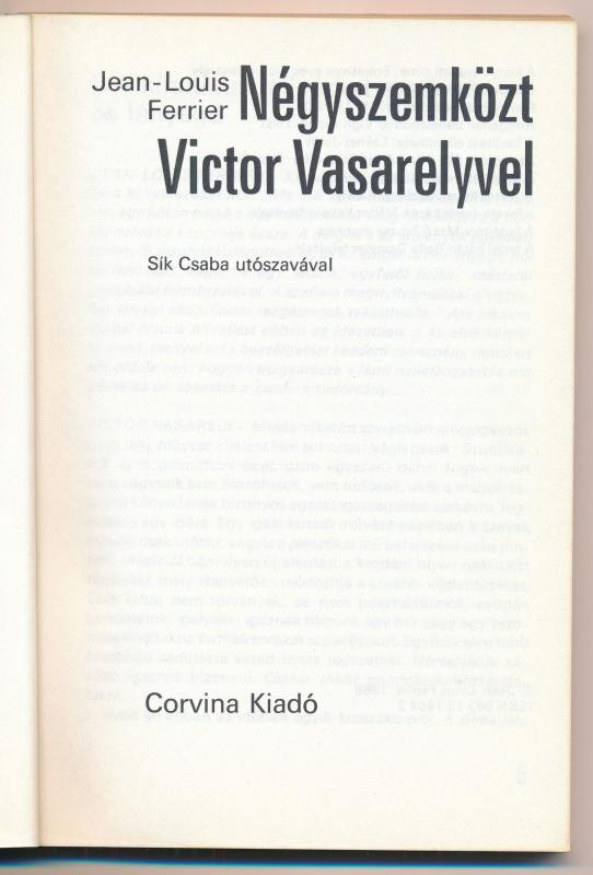 Ferrier, Jean-Louis: Négyszemközt Victor Vasarelyvel. 1981, Corvina. K... https://www.darabanth.com/de/506-Fernauktion/506.0/Bucher/Bucher-Architektur-Kunst~616/Ferrier-Jean-Louis-Negyszemkozt-Victor-Vasarelyvel-1981-Corvina-Kiadoi-papirkotes-jo-a~II3430466