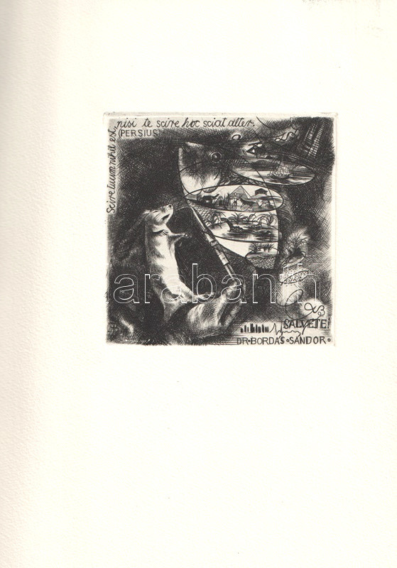 Galambos, Ferenc: Ferenc Bordas. Exlibris og lejlighedgrafik. (Négynyelvű album, számozott.) (Friderikshavn), 1978. Forlaget Exlibristen (Trykt hos Viggo Asmussen). 53 + [3] p. + 2 melléklet (eredeti rézkarc). Egyetlen kiadás. Összesen 300 példányban készült, illusztrált életrajzi album az elsősorban alkalmazott kisgrafikák műfajában alkotó Bordás Ferenc (1911-1982) festő, grafikusművészről. Sorszáma: 296. Kolofon: "Exlibrispublikation nr. 152 er udsendt af forlaget Exlibristen (Klaus Rödel, Lyövet 5, DK-9900, Friderikshavn) i maj 1978. Bogen er sat med Garamond og trykt hos Viggo Asmussen, Frederikshavn, i 300 nummerede eksemplarer. Dette eksemplar har hr: 296." A dán, német, angol és francia nyelvű rövid életrajzi méltatás után, a 21. oldaltól válogatás a mester Ex libriseiből. (Exlibrispublikation Nr. 152.) Fűzve, illusztrált kiadói védőborítóban. Jó példány.