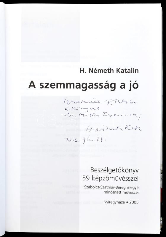 H. Németh Katalin: A szemmagasság a jó. Beszélgetés 59 képzőművésszel. Szabolcs-Szatmár-Bereg megye minősített művészei. Nyíregyháza, 2005. K.n. A szerző által DEDIKÁLT példány! Kiadói kartonált papírkötés, enyhén foltos borítóval.