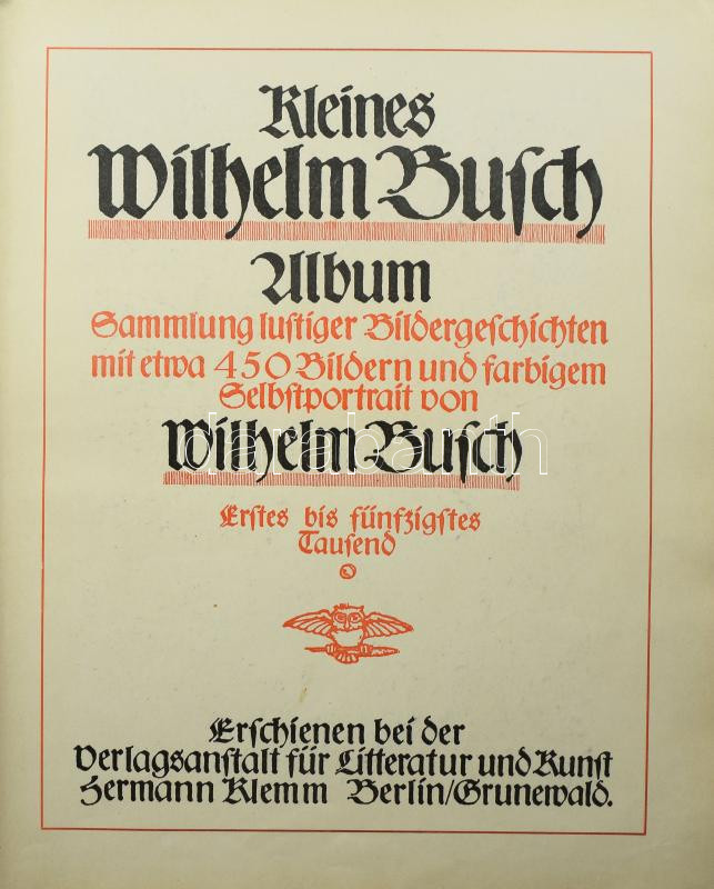 Kleines Wilhelm Busch Album. Berlin - Grunewald, én., Hermann Klemm, 1 t.+176 p. Német nyelven. Gazdag képanyaggal illusztrált. Kiadói félvászon-kötésben, kopott, foltos borítóval, kijáró lapokkal.