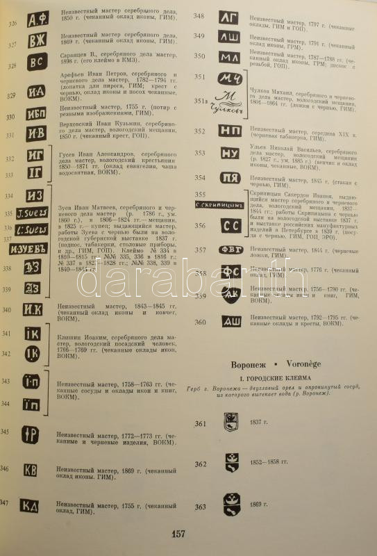 Platonova-Posztnyikova: Ezüst- és aranyékszerek (fém)jelzései a XV-XX.... https://www.darabanth.com/de/506-Fernauktion/506.0/Bucher/Bucher-Architektur-Kunst~616/Platonova-Posztnyikova-Ezust-es-aranyekszerek-femjelzesei-a-XV-XX-szazadig-Moszkva-1995~II3430081