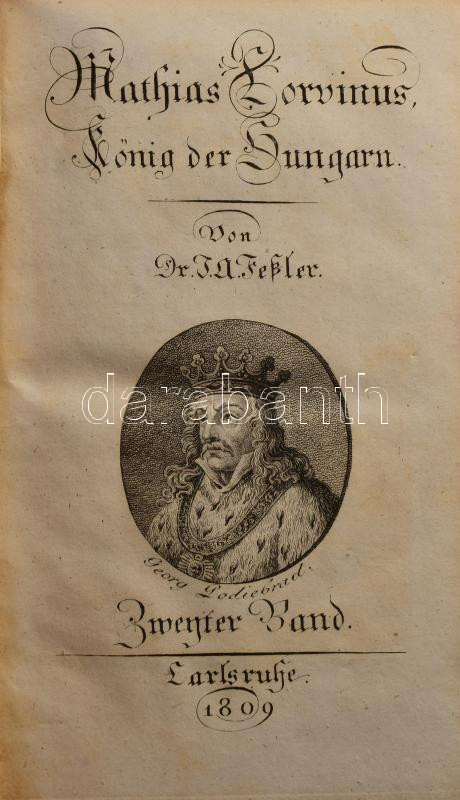 [Feßler, Ignaz Aurelius /Fessler Ignác Aurél (1756-1839)] Feßler, I[gnaz] A[urelius]:Mathias Corvinus, König der Ungarn. I-II. Bände. Gemälde aus den alten Zeiten der Hungarn III. Bände. Karlsruhe, 1809, 1 (címkép) t. + 1 (díszcímlap) t. +VIII+[IX]-296 p.; 1 (címkép) t. + 1 (díszcímlap) t.+318 p. Német nyelven. Korabeli félbőr-kötések, az egyik kötet lapélei festettek, kopott borítókkal, az egyik gerincen kis sérülésekkel, régi bélyegzésekkel, kissé eltérő méretű példányok (19x12 cm, 18x11,5 cm.)