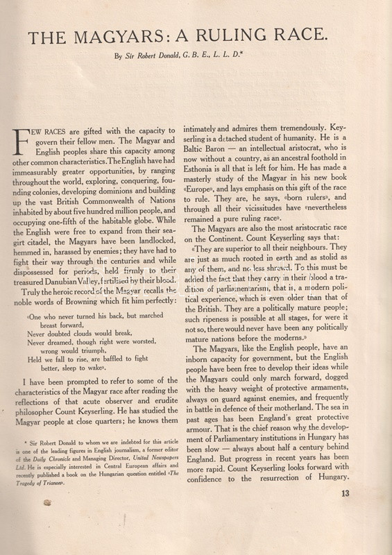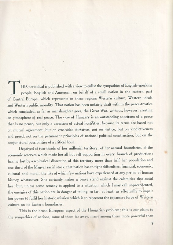 A magyar revíziós szándékok mellett kiálló, Lord Rothermere nevével jelzett brit sajtókampány nyomán 1927-től a magyar kulturális diplomácia fontos, érvekkel, adatokkal meggyőzhető politikai piacot vélt felfedezni az angol-amerikai olvasóközönségben. A magyar és angol egyetemi tanárokból, szépírókból felálló szerkesztőbizottság e törekvés nyomán "Hungary Illustrated" címen jelentette meg gazdagon illusztrált, angol nyelvű folyóiratát, melyből évente négy számot terveztek közreadni. A Magyarország és a magyar nép dicső múltjáról, illetve gazdasági és kulturális eredményeiről beszámoló folyóiratból végül csak ez az egyetlen szám jelent meg.