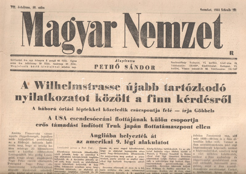 [II. Világháború] Magyar Nemzet. Pethő Sándor riportlapja. VII. évfolyam, 40. szám. (Napilap, 1944 február 19.) "A Wilhelmstrasse újabb tartózkodó nyilatkozatot közölt a finn kérdésről -- A USA csendesóceáni flottájának külön csoportja erős támadást indított Truk japán flottatámaszpont ellen -- Angliába helyezték át az amerikai 9. légi alakulatot -- Újból nagy képaukció a gróf Almási-Teleki Művészeti Intézetben -- Göbbels cikke a bolsevista veszélyről".