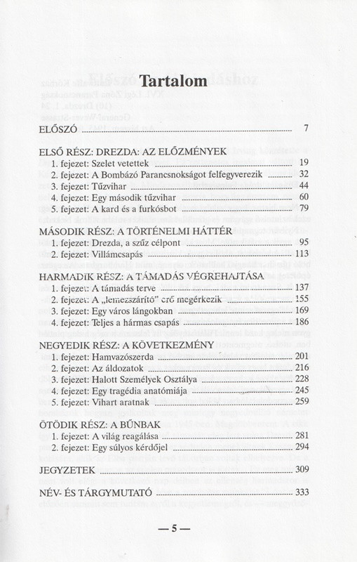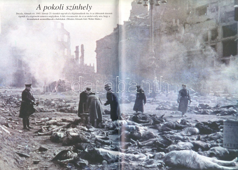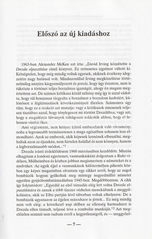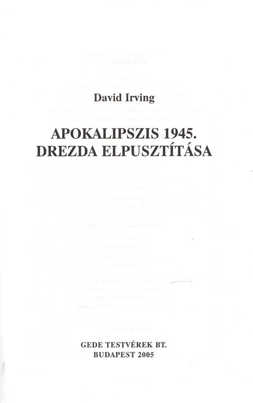 David Irving (sz. 1938) angol hadtörténész kötete eredeti nyelven először 1963-ban jelent meg. A szövetségesek által elkövetett háborús bűntettet vizsgáló munka elsőmegjelenésekor komoly történészi elismerésben részesült, egyes fejezeteiből Kurt Vonnegut amerikai író "Ötös számú vágóhíd" című regénye is idéz. A német radikálisokhoz közeledő szerző később holokauszttagadó nézetei, illetve a szakmai etika határait feszegető módszertana miatt hitelvesztetté vált történészi körökben. Oldalszámozáson belül néhány hadműveleti vázlatot is tartalmazó monográfiája Drezda 1945-ös februári angol-amerikai bombázásának politikai, katonai összetevőit vizsgálja, társadalmi hatását és sajtóvisszhangját elemzi.