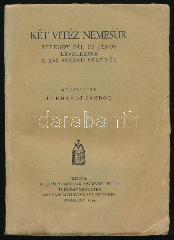 Két vitéz nemesúr Telegdy Pál és János levelezése a 16. század végéről. Közzétette Eckhardt Sándor. Bp. 1944, Kir. Magy. Pázmány Péter Tudományegyetem Magyarságtudományi Intézete. 218 l., 1 lev. Kiadói papírborítóban.