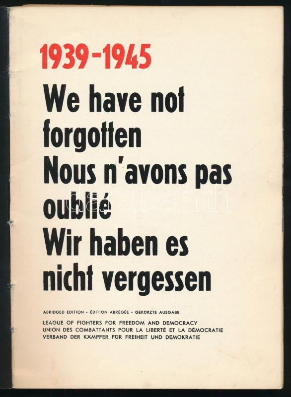 Tadeusz Mazur-Jerzy Tomaszewski: 1939-1945. We have not forgotten. Nous n' avons pas oublié. Wir haben es nicht vergessen. Warszawa, 1961, Polonia Publishiing House. Kiadói papírkötés, gerinc sérült, kopottas állapotban.
