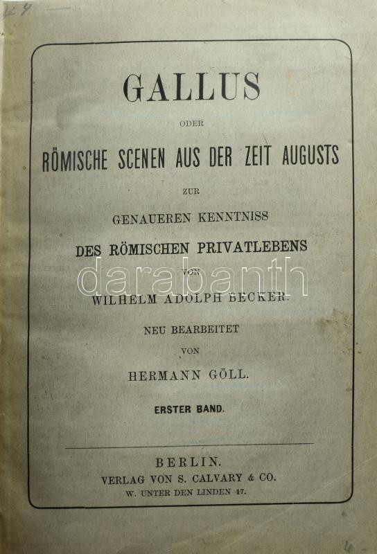 Wilhelm Adolph Becker: Gallus oder römische Scenen aus der Zeit Augusts. 1-2. Theile. Zur genaueren Kenntniss des römischen Privatlebens. Neu Bearbeitet von Hermann Göll. Berlin, 1880-1881, S. Calvary & C., 2+XIV+232 p.;VIII+462 p. Átkötött aranyozott félvászon-kötés, márványozott lapélekkel, kopott borítókkal, az egyik kötet címlapja restaurált.
