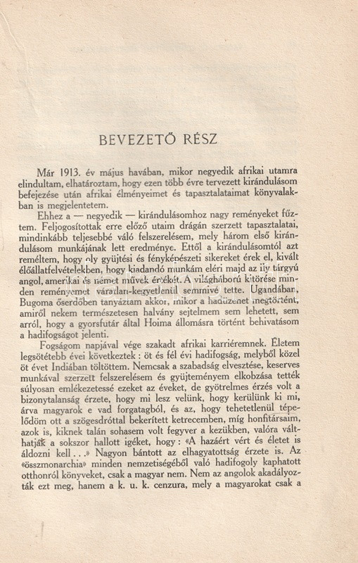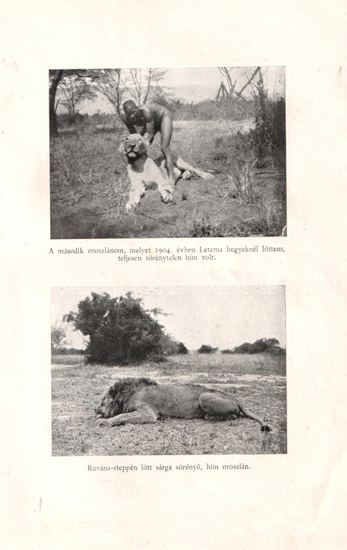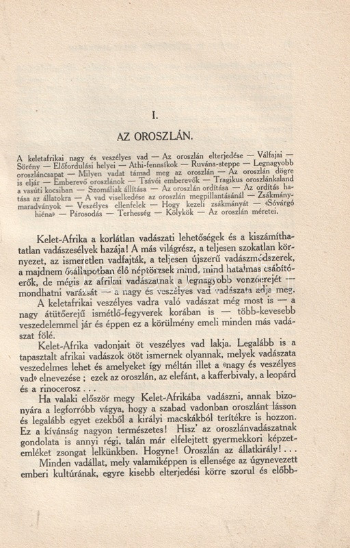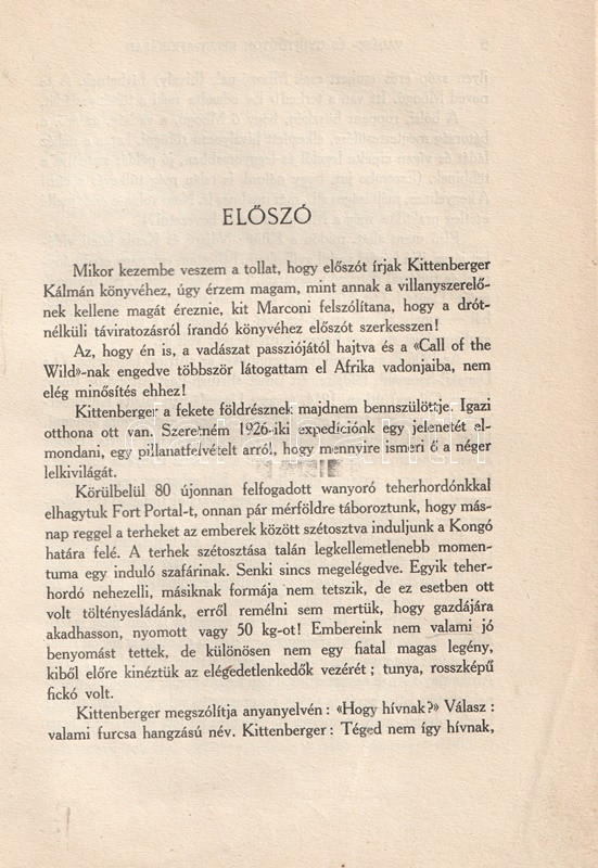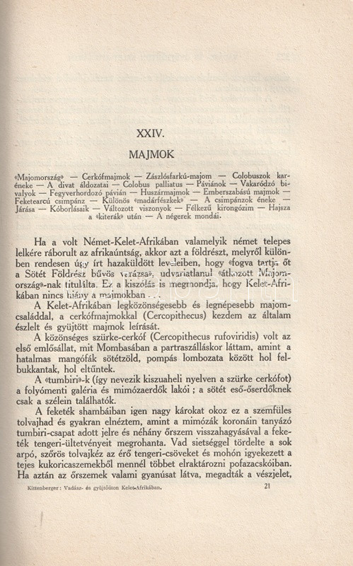 Kittenberger Kálmán (1881-1958) Afrika-kutató, zoológus, vadászati író. 1903-tól hat alkalommal bejárta Kelet-Afrikát, összesen 16 évet töltött a trópusi kontinensen. Utazására állatpreparátori megbízásából került sor, gazdag preparátum-gyűjteménye később a Nemzeti Múzeumot gazdagította. Kötete tematikus módon épül fel, a vadászott állatok típusai szerinti csoportosításában, így az oroszlán- és rinocérosz-vadászati fejezetek után elefánt- és majomkalandok is szerepelnek a gyűjteményes munkában, melynek első kiadása 1927-ben jelent meg. Példányunk a harmadik kiadásból való.