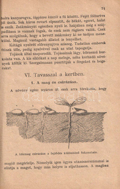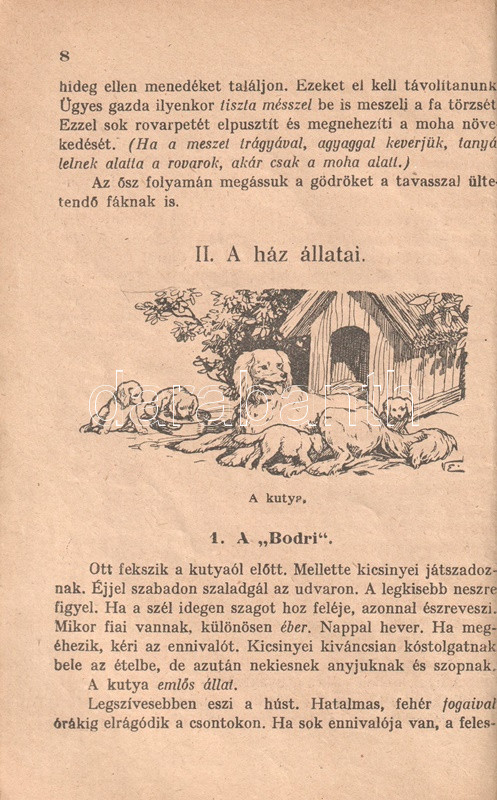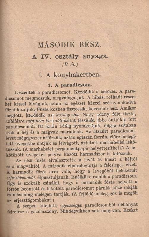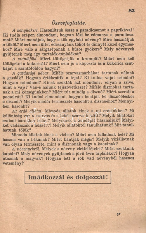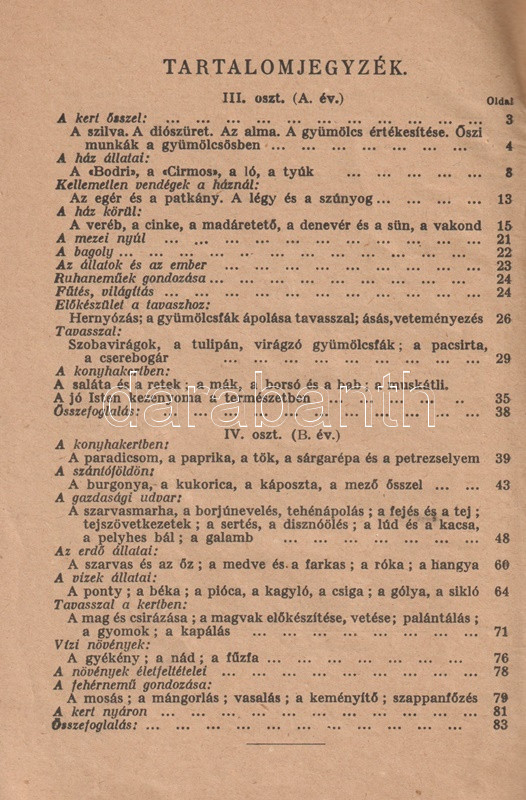 Oldalszámozáson belül Vezényi Elemér rajzaival illusztrált természetrajzi és háztartástani tankönyv a vidéki katolikus népiskolák számára: kötetünk nagy terjedelmet szentel a veteményes körüli teendőknek, bővebben ír a vidéki háztartás kártevőiről és haszonállatairól, valamint az erdők és mezők, legelők jószágairól. Példányunk a munka tizedik kiadásából való.