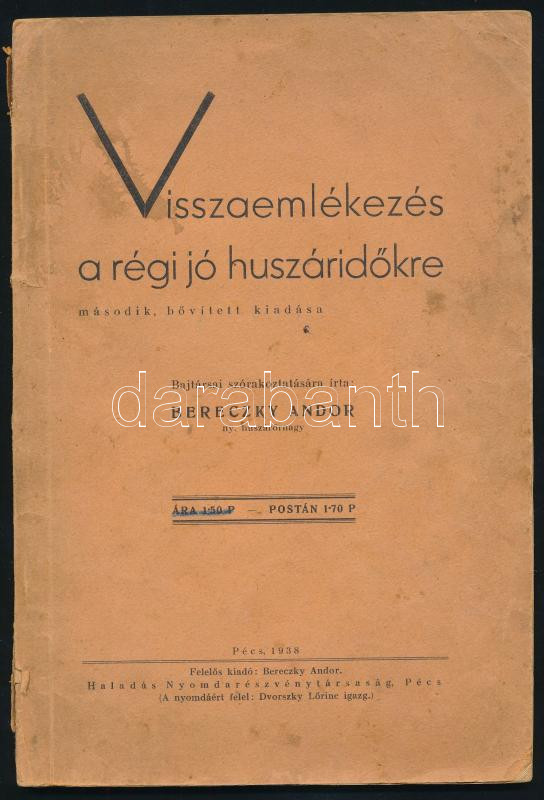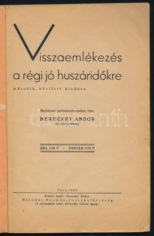 Bereczky Andor: Visszaemlékezés a régi jó huszáridőkre. Bajtársai szórakoztatására írta: - - . Pécs, 1938, szerzői kiadás (Haladás-ny.), 77+(3) p. Második, bővített kiadás. Kiadói papírkötés, sérült, foltos borítóval, helyenként kissé foltos lapokkal, ex libris-szel.