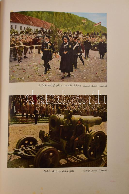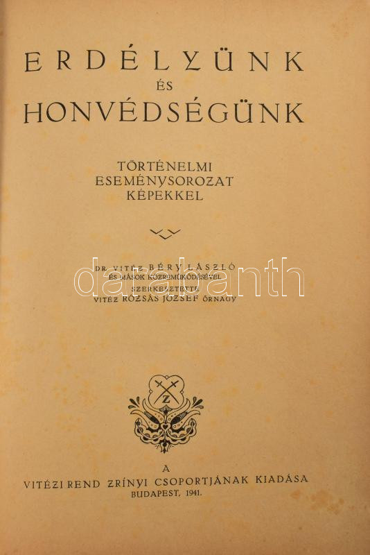 Erdélyünk és honvédségünk. Történelmi eseménysorozat képekkel. Dr. vitéz Béry László és mások közreműködésével szerk.: vitéz Rózsás József Å‘rnagy. Bp., 1941, Vitézi Rend ZrÃnyi Csoportja, 1 (szÃnes cÃmkép, Horthy Miklós portréja) t.+ 224 p. + LXXX (fekete-fehér képek) t.+ 8 (szÃnes) t.+ 1 (térkép) t. Kiadói festett, Erdély cÃmerével dÃszÃtett félvászon-kötés, kijáró lapokkal (14 lap (L-LXIII oldalak között), kissé kopott, foltos borÃtóval.