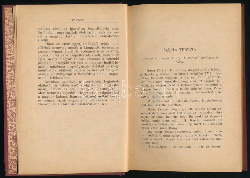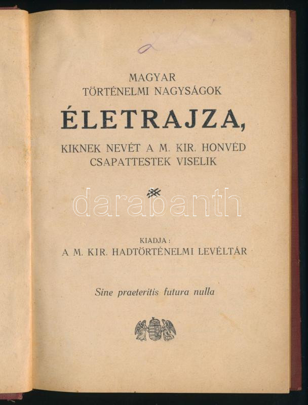 Magyar történelmi nagyságok életrajza, kiknek nevét a m. kir. honvéd csapattestek viselik. Kiadja: A M. Kir. Hadtörténelmi Levéltár. (Bp., 1930, Ladányi-ny.), 235+(5) p. Egyetlen kiadás. Egészvászon-kötésben, kissé viseltes borítóval. (Ritka!)