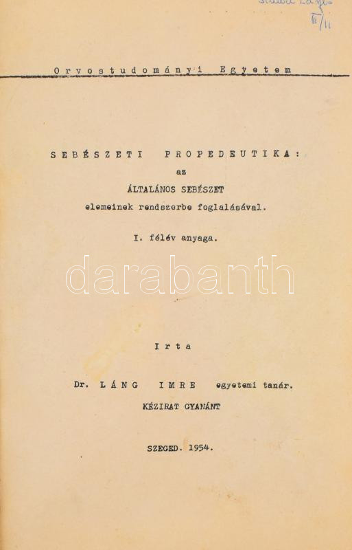 A Szegedi Orvostudományi Egyetem 2 db jegyzete: Láng Imre: Sebészeti propedeutika az általános sebészet elemeinek rendszerbe foglalásával. I. félév anyaga. (Kézirat gyanánt). Szeged, 1954, Orvostudományi Egyetem. Átkötött félvászon-kötésben, kissé viseltes borítóval, helyenként bejegyzésekkel, aláhúzásokkal. + Németh András: Urológia. Szeged, [1984], Orvostudományi Egyetem. Kiadói papírkötés, kissé sérült borítóval és gerinccel, helyenként ceruzás aláhúzásokkal. Megjelent 250 példányban.