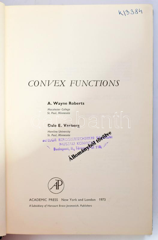 A. Wayne Roberts - Dale E. Varberg: Convex functions. New York and London, 1973, Academic Press. Kiadói egészvászon kötés, jó állapotban.