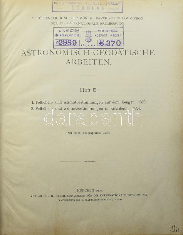 Astronomisch-Geodätische Arbeiten. Heft 5. München, 1903, K. Bayer, 8+187 p.+1 t. Német nyelven. Korabeli félvászon-kötés, kissé kopott borítóval, régi bélyegzésekkel.