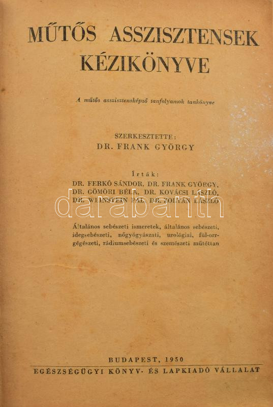 Frank György (szerk.): Műtős asszisztensek kézikönyve. A műtős asszisztensképző tanfolyamok tankönyve. Bp., 1950., Egészségügyi, 291 p. Átkötött félvászon-kötés, kopott, foltos borítóval, javított kötéssel, a hátsó táblán és a hátsó szennylapon fekete foltokkal.