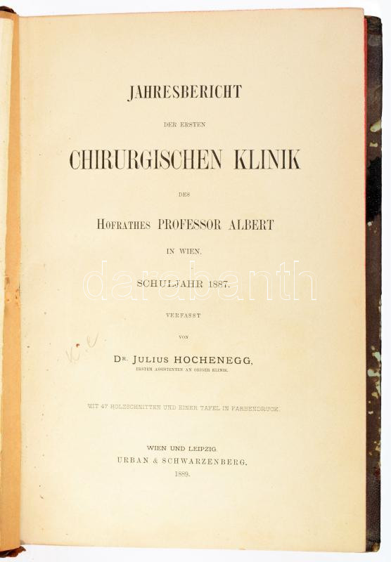 Julius Hochnenegg: Jahresbericht der ersten Chirurgischen Klinik des Hofrathes Pressor Albert in Wien. Schuljahr 1887. Verfasst von Dr. - -. Wien-Leipzig, 1889, Urban & Schwarzenberg, 1 (színes litográfia) t. + XXII+2+252 p. Német nyelven. Szövegközti fekete-fehér fametszetekkel illusztrált. Korabeli aranyozott gerincű félbőr-kötés, kopott borítóval, a hátsó táblán a borítás sérült, a litográfia kijár.