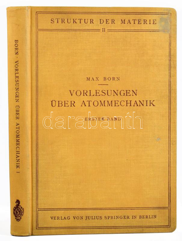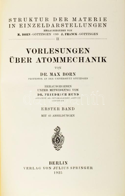 Max Born: Vorlesungen über Atommechanik. Erster Band. Hrsg. unter Mitwirkung von Dr. Friedrich Hund. Struktur der Materie in Einzeldarstellungen II. Berlin, 1925, Julius Springer, IX+358 p.+1 t. Német nyelven. Kiadói egészvászon-kötés, kopott borítóval.