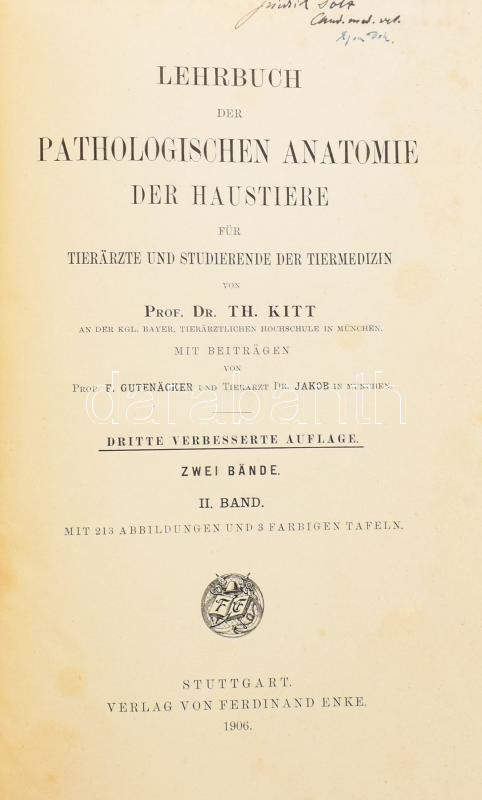 Prof Dr. Th[edor] Kitt: Lehrbuch der Pathologischen Anatomie der Haustiere für Tierärzte und Studierende der Tiermedizin. II. Band. Stuttgart, 1906, Ferdinand Enke, IV+4+754+4 p.+III t. Német nyelven. Dritte Auflage. Szövegközti fekete-fehér illusztrációkkal és 3 színes képtáblával. Német nyelven. Kiadói egészvászon-kötés, festett lapélekkel, kissé kopott borítóval, néhány ceruzás aláhúzással.
