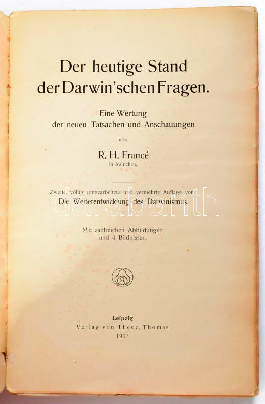 R. H. Francé: Der heutige Stand der Darwin'schen Fragen. Eine Wertung der neuen Tatsachen und Anschauungen. Leipzig, 1907, Thod. Thomas. Német nyelven. Kiadói papírkötés, sérült, hiányos borítóval, sérült, hiányzó gerinccel.