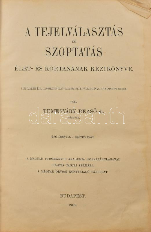 Temesváry RezsÅ‘: A tejelválasztás és szoptatás élet- és kórtanának kézikönyve. Bp.,1901, Magyar Orvosi Könyvkiadó Társulat, VIII+876 p. Fekete-fehér fotókkal illusztrációkkal. Kiadói aranyozott egészvászon-kötés, kopott, foltos borÃtóval, foltos lapélekkel, egykorú breznóbányai névbejegyzéssel.