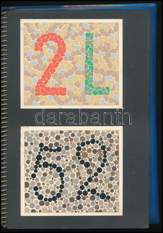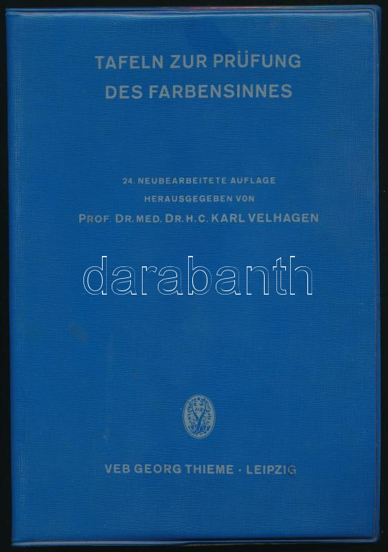 Velhagen, Karl: Tafeln zur Prüfung des Farbensinnes. Leipzig, 1967, VEB Georg Thieme, 14 p.+ 16 (színlátás tesztelésére szolgáló színes táblák) t. Német nyelven. Kiadói nyl-borítóban, kissé viseltes állapotban.